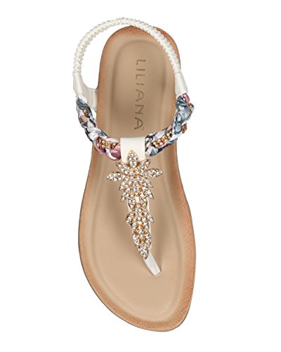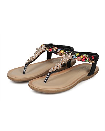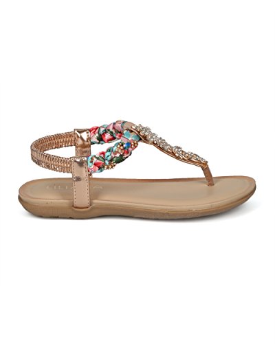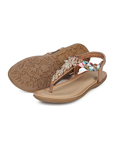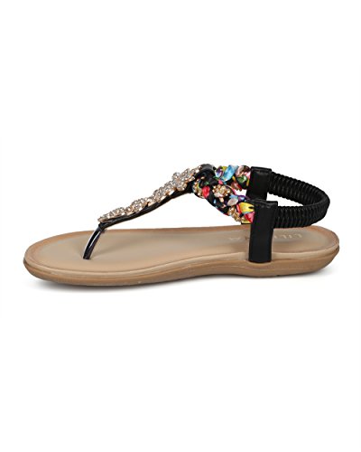 Product Description These convenient sandals are made with a vegan upper, t-strap construction and a rhinestone embellished braided ankle strap. Also made with rhinestone encrusted leaves appliques, stretchy slingback strap and a flat heel. 0