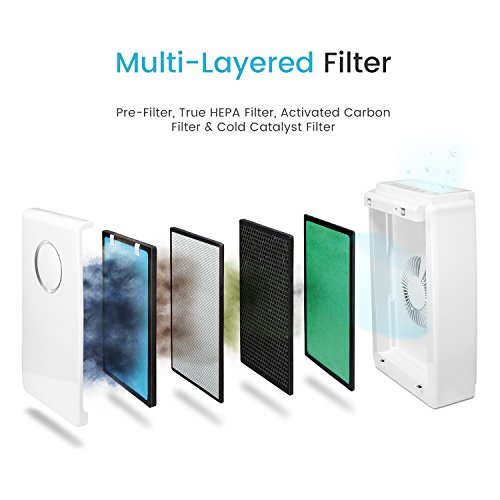 - 5-in-1 Air Purification System - Pre-Filter, True HEPA Filter, Activated Carbon Filter and Cold Catalyst captures up to 99.97% of airborne particles