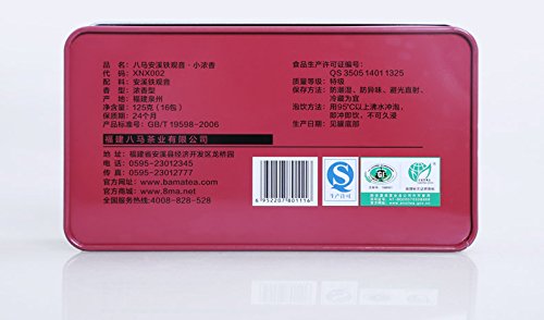 -. Feature : 125g, 15bags / XNX002 Strong Aroma / Shelf Life: 24 Month / AUTHENTIC brand,TRADITIONAL processing, ORIGIN product place! / Bama means eight horse in Chinese. Anxi Tea of Bama Co., Ltd. has originated from the time-honored brand Xinji. The predecessor Mr. Wang is the descendant of Shirang Wang in Qing Dynasty, who discovered and cultivated "Tie Guan Yin" as the worldwide famous tea.Bama has been the largest manufacturer of Anxi Tie Guan Yin tea in China. Their tea manufacturing management is top in China, and they have our own hereditary and proP.R.Ietary blending and roasting processes.Meanwhile, Bama Tea has won many honor and P.R.Ize. In the first competition of AnXi Tie Guan Yin Tea, Bama Tea became the winner of Top 10 enterP.R.Ises and top 10 brands.