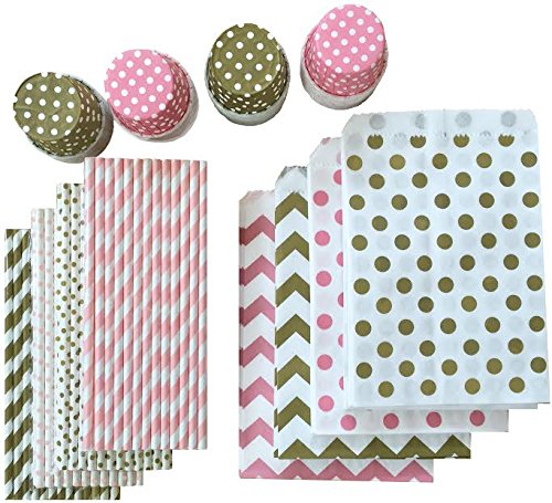 Product Description We have combined some of our top selling party goods into one convenient bundle to get the party started. This happy combo is perfect for a birthday, bridal or baby shower. Each party kit includes 100 paper drinking straws in 4 different patterns, 48 5.5 x 7.5 inch paper favor bags in 4 different patterns and 48 paper candy/nut cups which measure 2 inches across in 4 different colors. 0