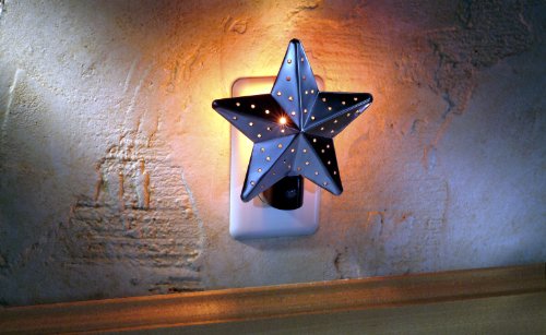 As sweet as a twinkling star, but offering a bit more light than gazing up at the real thing, this 75050VB night light by AmerTac works well in a bedroom, hallway, or anywhere in need of nighttime illumination. Constructed of tin with a Venetian bronze finish and shaped into a three-dimensional five-pointed star, the night light features not only several hole punches to allow light to shine through, but it also comes with a photocell sensor that automatically turns the light on at dusk and off at dawn for convenient energy-efficient operation. The UL-listed night light measures 3 inches long by 4-7/8 inches wide by 4-7/8 inches high and comes with a replaceable 7-watt bulb.