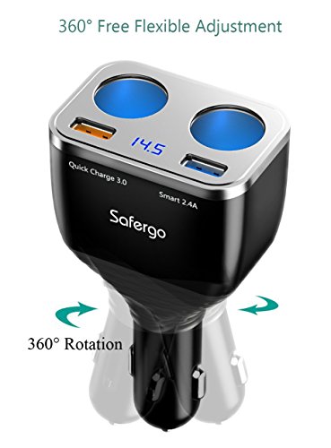 Safergo 2 Sockets Cigarette Lighter Splitter, 80W 12V/24V Adapter Quick Charge 3.0 Smart 2.4A Dual USB Car Charger with Voltage Display for iPhone iPad Samsung, C28s