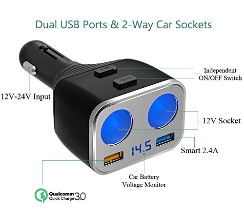 - Independent ON/OFF Switches & Battery Voltage Display: No need to plug and unplug your chargers, reduce wear and tear, expand lifespan of the device. Warn with flashing when car voltage is less than 12V.
