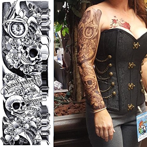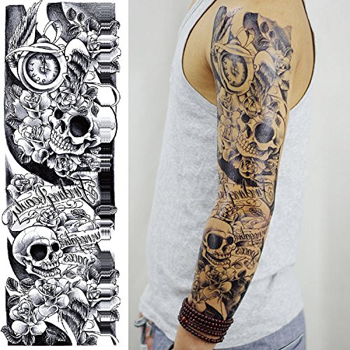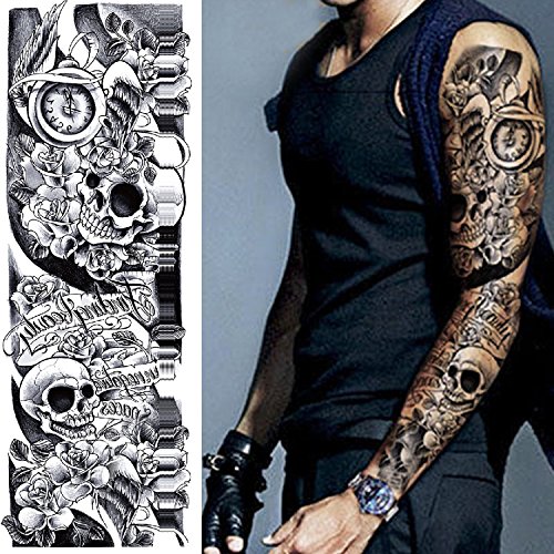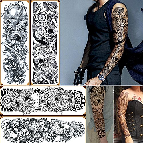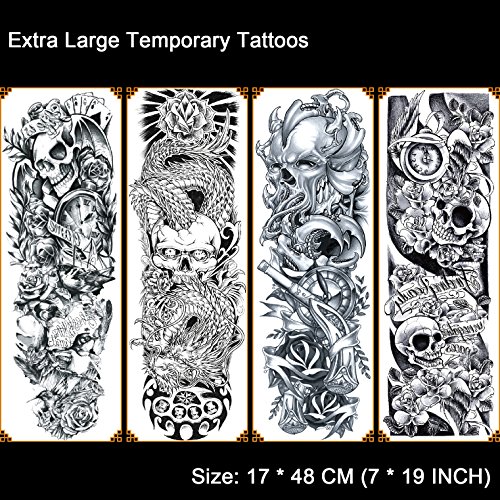 070FC 4-Sheet Large Temporary Tattoos Big Long Full Arm Tattoo Sticker Unisex Body Art Skull Flower Pattern Waterproof Fake Tattoos Sleeve