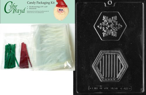 Cybrtrayd MdK50C-C422 Snowflake Pour Box Christmas Chocolate Mold with Chocolate Packaging Kit and Molding Instructions, Includes 50 Cello Bags, 25 Red and 25 Green Twist Ties