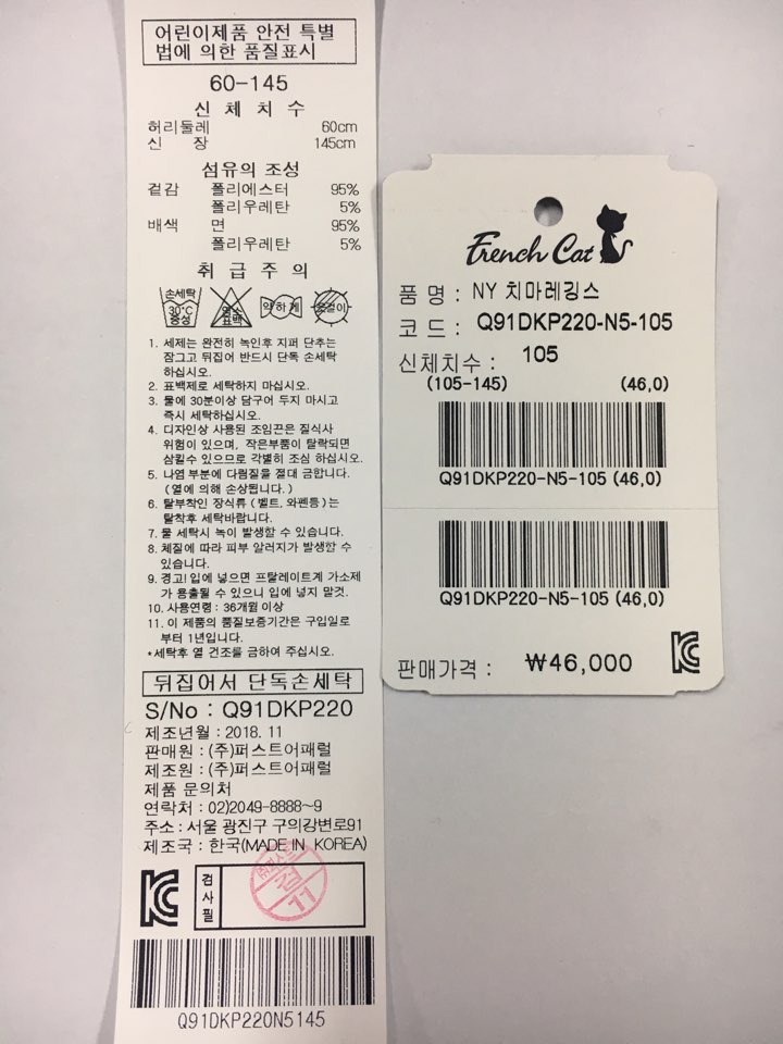 제품소재 : 겉감:폴리에스터95%폴리우레탄5%배색:면95%폴리우레탄5%