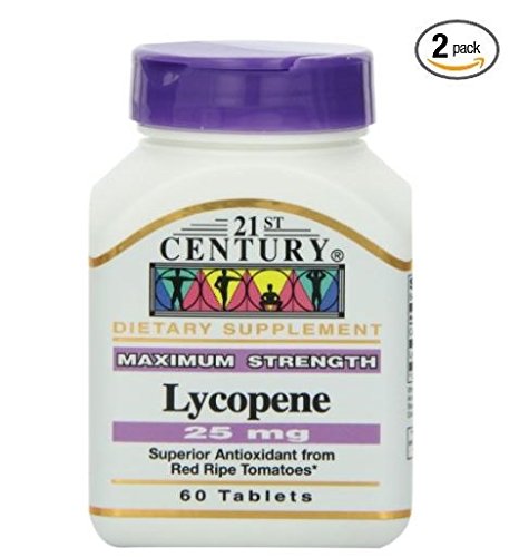 Studio : 21st Century Publisher : 21st Century Binding : Health and Beauty Product Description 21st Century's Lycopene, found in red ripe tomatoes, provides superior antioxidant benefits and promotes healthy prostate function.* Each maximum strength tablet conatins 25 mg (25,000 mcg) of Lycopene, approximately the same amount as 5 medium red ripe tomatoes. Unconditionally guaranteed for purity, freshness and label potency. No added Sugar, Yeast, Preservatives or Artificial Flavors.