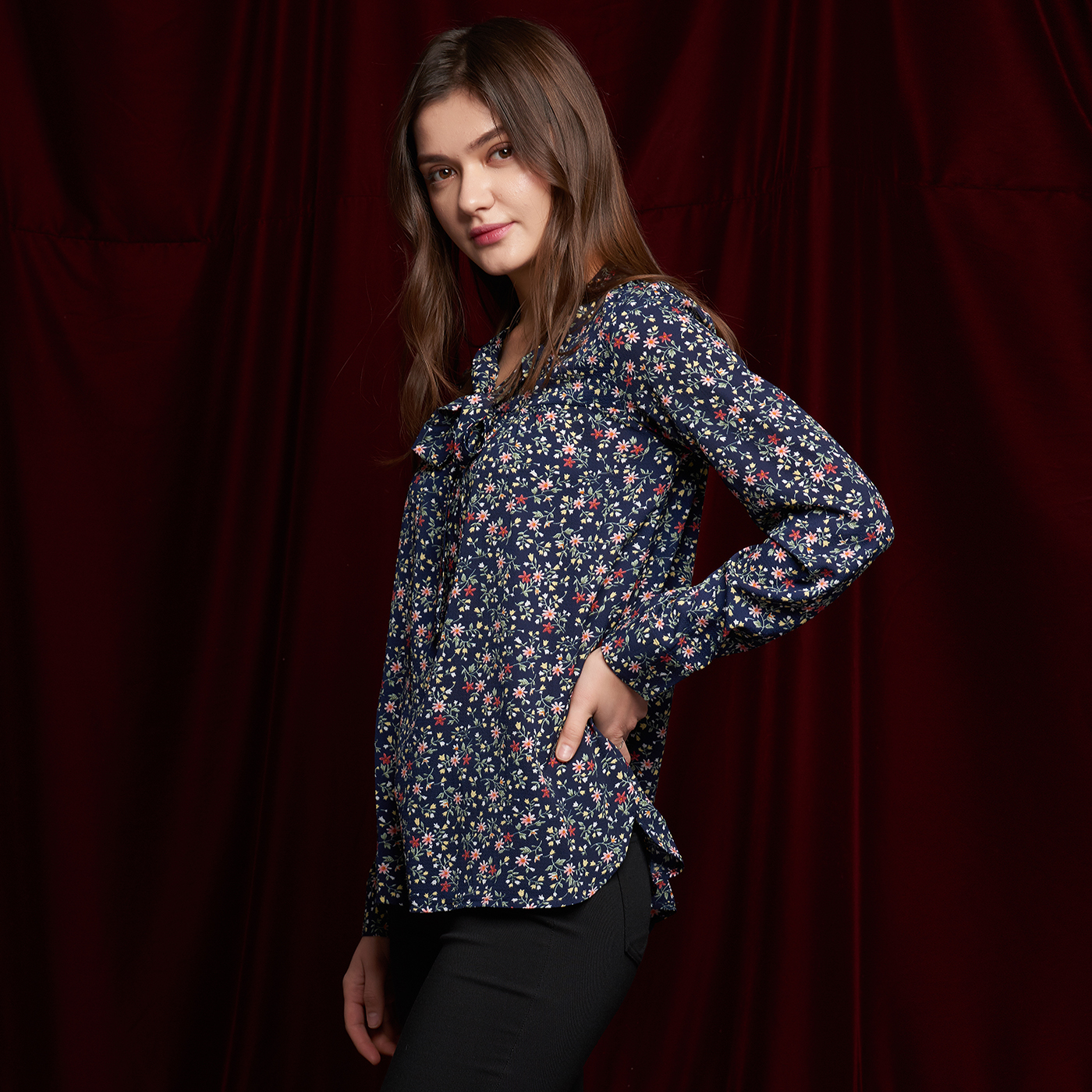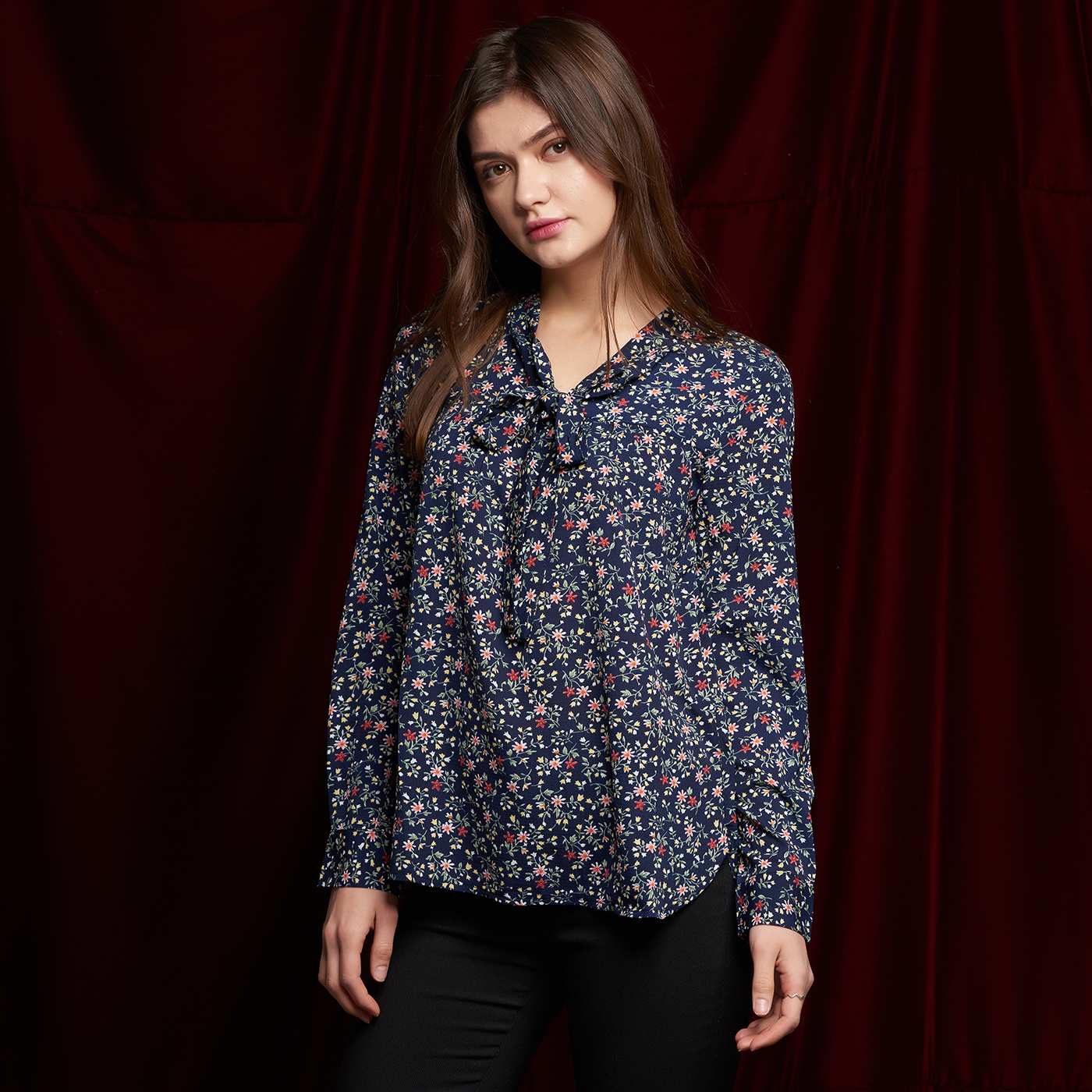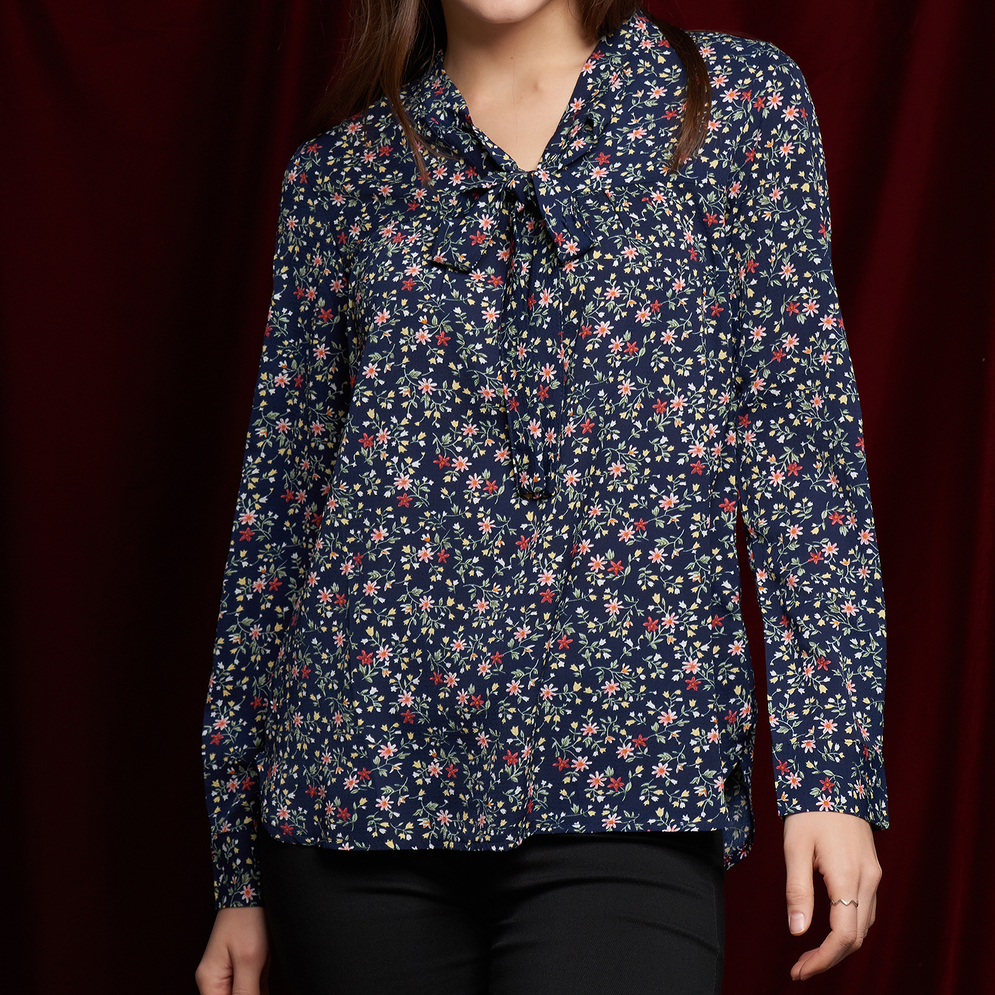 플라워 패턴의 넥라인의 리본 디테일이 귀여운 블라우스 입니다.
