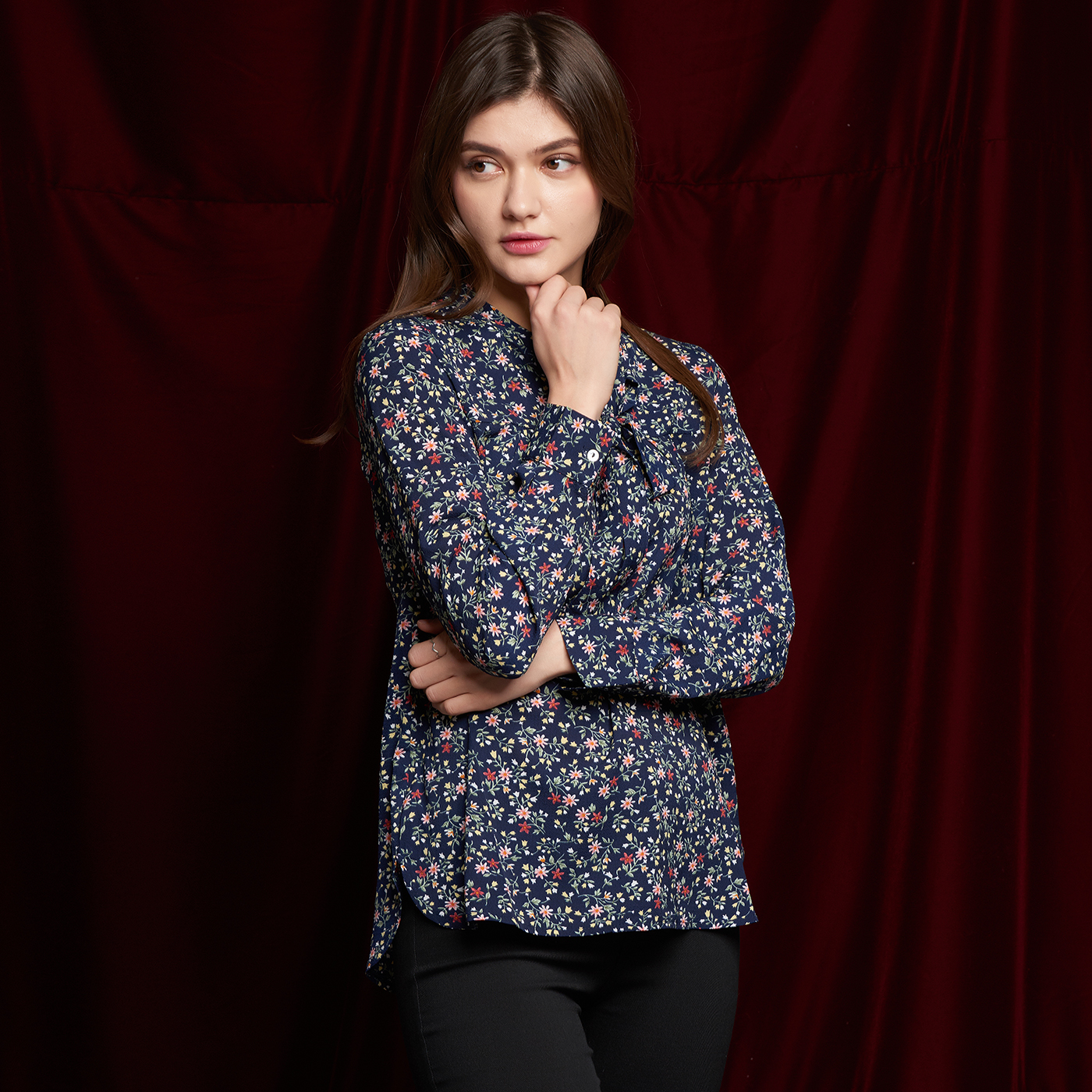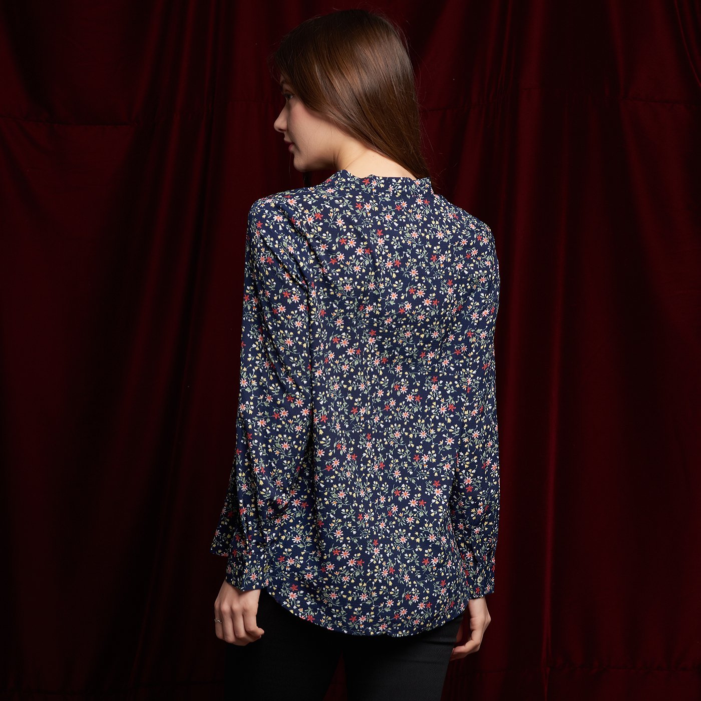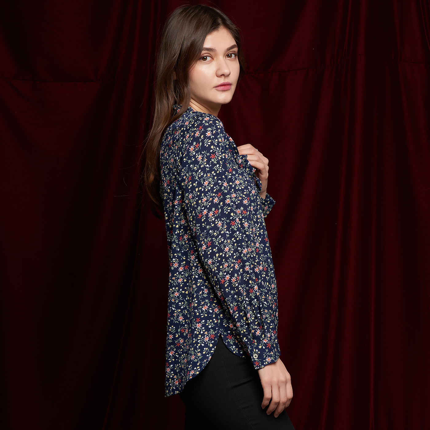 플라워 패턴의 넥라인의 리본 디테일이 귀여운 블라우스 입니다.