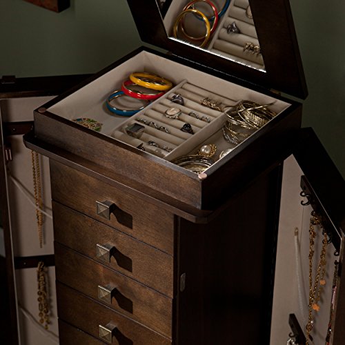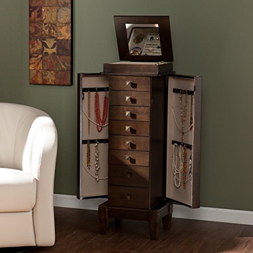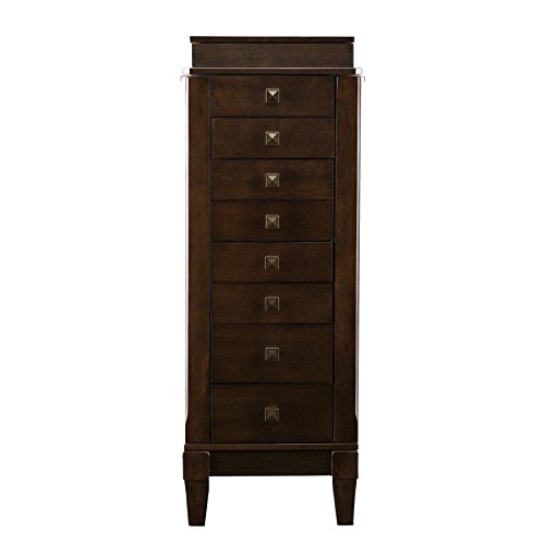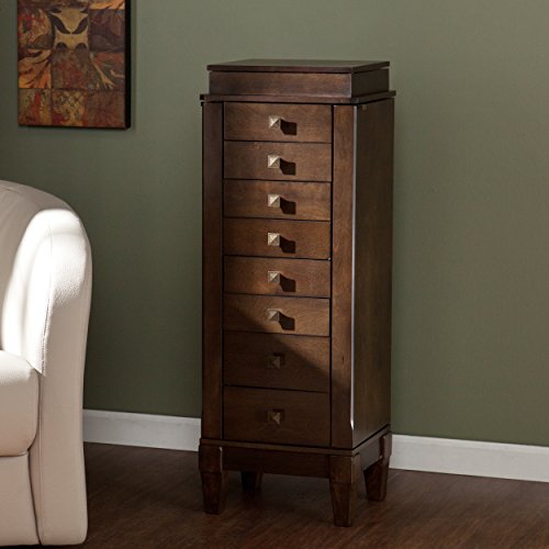 Studio : SEI Publisher : SEI Product Description A vertical design, limed antique gray-brown oak finish, and squared antique bronze drawer pulls give this beautiful Upton Home jewelry armoire a spark of Asian influence. Top lifts to reveal a mirror and jewelry box with two compartments and numerous rows of cushioned ring holders. The two upper drawers are divided into nine small and six medium compartments for earrings and pins of various sizes, while larger accoutrements fit neatly within drawers below. Side panels swing open for easy access to double hooks that hang necklaces and bracelets securely. Interior is fully lined with cream colored felt to shield jewelry against scuffs and scratches. Upton Home, Traditional Furniture to Design Your LifeMaterials: Poplar, MDF, birch veneer, particle board, 3 millimeter mirror, metal, feltFinish: Gray-brown oakVast array of storage to organize jewelry and accessoriesFreestanding armoire includes one (1) flip-top box, eight (8 drawers), and two (2) side doors with magnetic closureConvenient lift-up mirror inside top boxCream felt lining protects delicate itemsLimed antique gray-brown oak finish with antique bronze hardwareStorage: Two (2) compartments/ eleven (11) ring rows (box), two (2) sectioned drawers, four (4) standard drawers, two (2) larger drawers, sixteen (16) double hooksFully open: 50.25 inches high x 33.5 inches wide x 14.75 inches deepMirror: 8 inches high x 8 inches wideBox: 4.25 inches wide (ring rows), 2 inches high x 3.5 inches wide x 9.75 inches deep (compartments)Drawers: 2 inches high x 8 inches wide x 7.75 inches deep (standard), 3.5 inches high x 8 inches wide x 7.75 inches deep (larger)Clearance: 4 inches high x 10 inches wide x 7.25 inches deepSupports up to 8 pounds (per drawer)Position 2.25 inches from wall in order to fully open side doorsOverall dimensions: 40 inches high x 15 inches wide x 13.25 inches deepProduct weight: 54.5 poundsAssembly required. Furniture Pattern: SolidFurniture Room: Bedroom, BathroomProduct Features: Mirror IncludedM 0