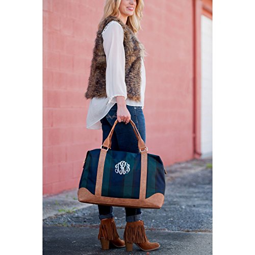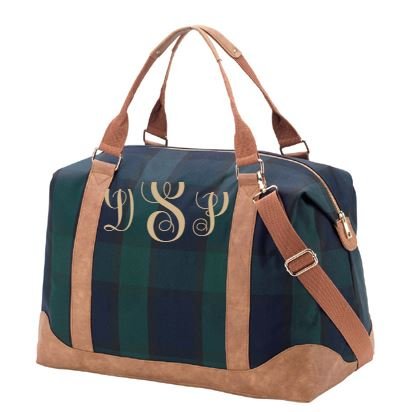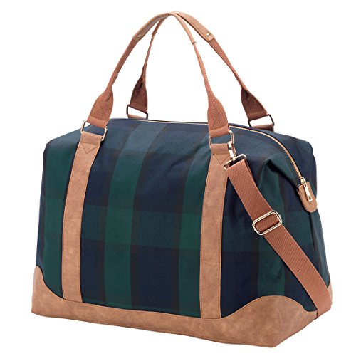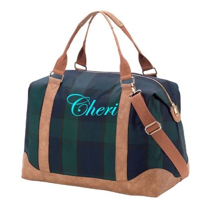 -. Brand : Wholesale Boutique -. Color : Navy -. Department : womens -. Feature : Plaid Polyester Material with Trendy Gold Accents*** Can be Personalized / Faux Leather Trim / Adjustable / Removable Strap, Double Handles / Inside zipper pocket and Reinforced Bottom / Measures: 20" L x 10.5" W x 16.5" H. -. Model : M445 -. PackageQuantity : 1 -. ProductGroup : Apparel -. ProductTypeName : LAGE -. Size : Blank -. Title : Plaid Fashion P.R.Int Weekender Bag with Faux Leather Trim *** Can be Personalized