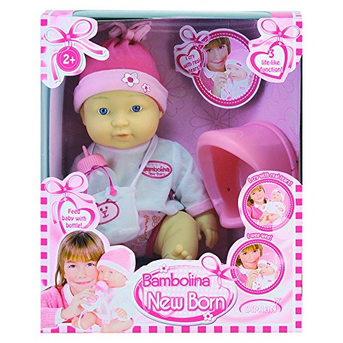 Mommy's here to wipe those tears! This 15-inch little baby Bambolina Newborn Doll from Dimian drinks, cries tears, and wets her diaper after she is given a bottle.