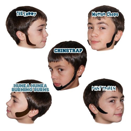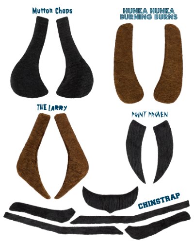 Like Mr. Moustachio, adults and kids alike can experience the fun and excitement associated with facial hair using these sideburns! Each package comes with a total of five sets of sideburns. Each package contains one each of the following styles: Mutton Chops, Chin Strap, Point Proven, The Larry and Hunka Hunka Burning Burns.