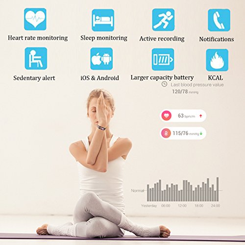 -. Feature : ♣Colorful Touch-screen: Smart bracelet with 1.06 inches OLED full touch screen, 1600 million color TFT liquid crystal material, under the sun can also show a clear response to the touch interface, enjoy the application of intelligent operation.A variety of background modes can be switched. / ♣Mulit-function Fitness Tracker:fitness tracker with a lot of function can track your all-day activities: Real-time heart rate monitor,step pedometer, calorie burnt, distance, automatic sleep monitoring, call alert, message alert, alarm clock alert, goal complete alert,sedentary alert, low-battery reminder, anti-lost alert, remote camera control, activity data sharing and so on, track your health so easy. / ♣IP67 Waterproof: Dust can not enter into the shell, which the entire diameter didn't beyond of the hole. Under normal temperature and pressure, when the shell is immersed in 5M deep water will not cause harmful effects. / ♣Cross-device compatibility:Compatible with Android & iOS smart phones. Such as iPhone 6/6S,7,7 Plus,8,8 Plus,X etc. Smart phone OS should be Android 4.4 / iOS 8.0 or a higher OS based supports Bluetooth 4.0 / ♣Free Replacement Wristband:The package come with a high quality free replacement wristband, you can change the wristband anytime and anywhere to fit your mood, the wristband is easy to remove and install.