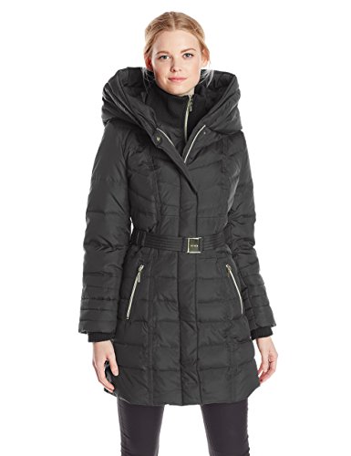 Stylish, fitted down jacket with a dramatic hood that has an inner vestige with knit collar for added warmth. The storm cuffs make the winter a little more bearable for added protection against wind and other elements.Feature