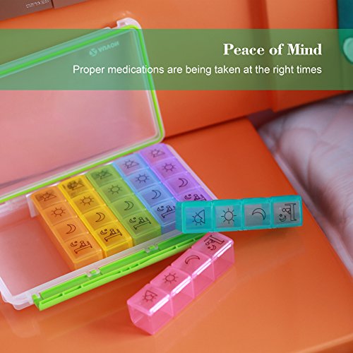 Easy to Use. The pill dispenser has a tested design to make it easier for you, especially for the elderly, to open the medicine box; This pill case also has a contoured design on the bottom for easy pill removal; The large compartments are manufactured from a translucent material thereby allowing easy monitoring which box is empty without opening.
