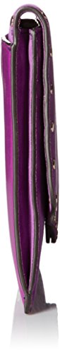 Biker-inspired clutch featuring flap closure trimmed in flat metallic studs