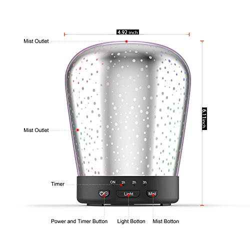SIZED WELL WITH ADJUSTABLE MIST OUTPUT. This essential oil diffuser holds up to 180ml of water, not too big, not too small. It can run up to 6 hours of continuous output. 3 Mist Modes, strong and light and intermittent. The intermittent mode has constant mist or 10-seconds duration. Operating time for intermittent running: Up to 8 hours.