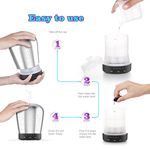 Easy to use, Portable and Safe Featuring one-button-operation switch, just fill with warm tap water and add few drops of your favorite essential oil. The capacity of Water tank is 180ml and the intermittent mist can last 10 hours. Easy to carry, you can take it anywhere, even on vacation. Very safe when in use, the automatic shut off is a safe feature when the water tank is empty.
