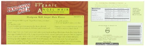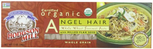 -. Feature : Health conscious pasta lovers will love the Hodgson Mill Organic Whole Wheat Angel Hair Pasta, made from organic durum whole wheat flour and organic flax seed milled from America's heartland. / Certified USDA Organic, Non-GMO, and Kosher, Hodgson Mill's Organic Whole Wheat Angel Hair Pasta easily cooks in 3-5 minutes; a perfect easy meal that everyone will love; tastes fabulous 'al dente' / Hodgson Mill's Organic Whole Wheat pasta is delicious as it is healthy; the organic milled flaxseed provides 500 mg of Omega-3's per serving and gives the pasta a tasty nutty flavor and great texture / The Hodgson Mill Organic Whole Wheat Angel Hair Pasta is an excellent source of fiber, and is high in protein, iron, thiamine and niacin / Hodgson Mill is a family owned company that has been producing high quality grain products with P.R.Ide for over 125 years, and is committed to using sustainable milling practices.