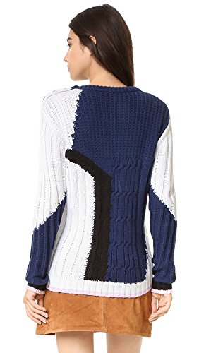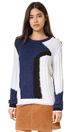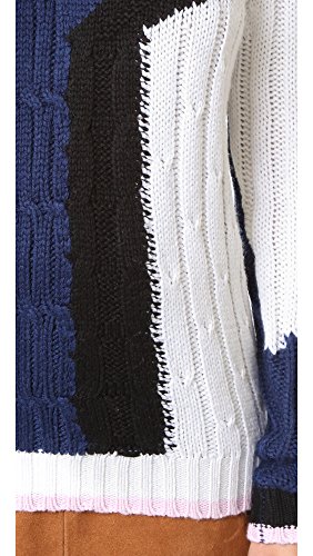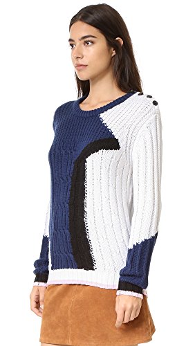 Buttons accent the shoulder on this quirky, colorblock Rebecca Minkoff sweater. Ribbed edges and long sleeves.