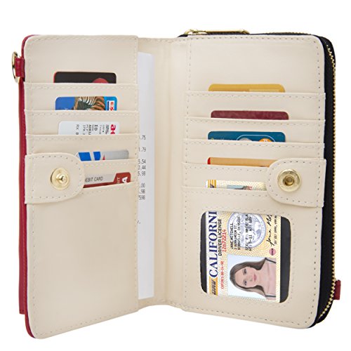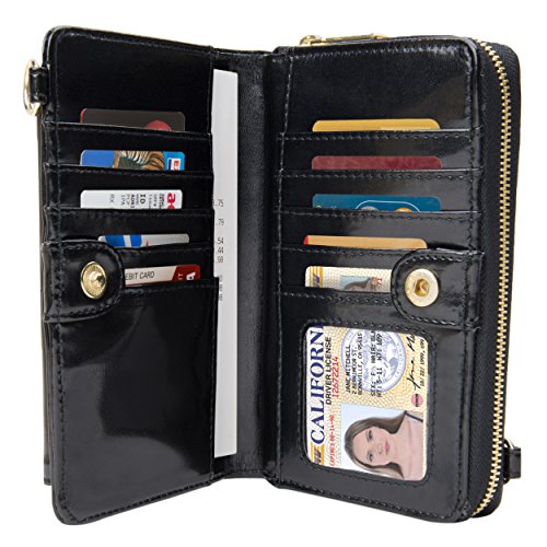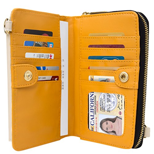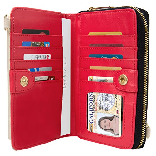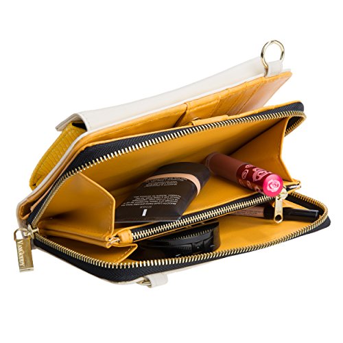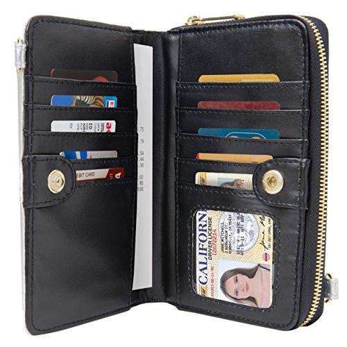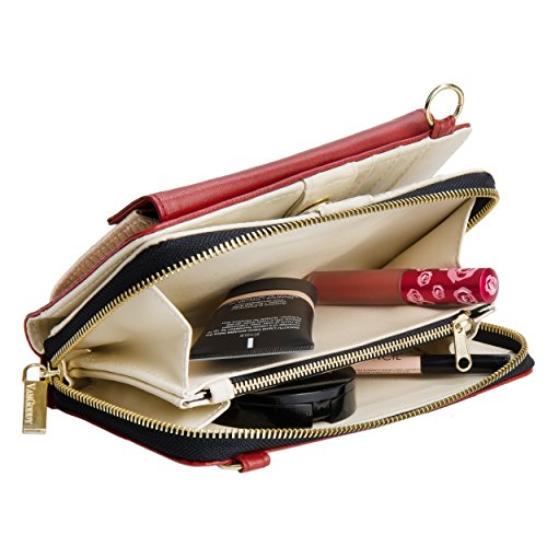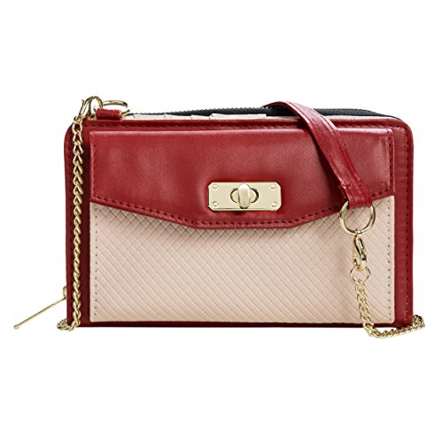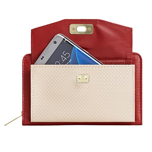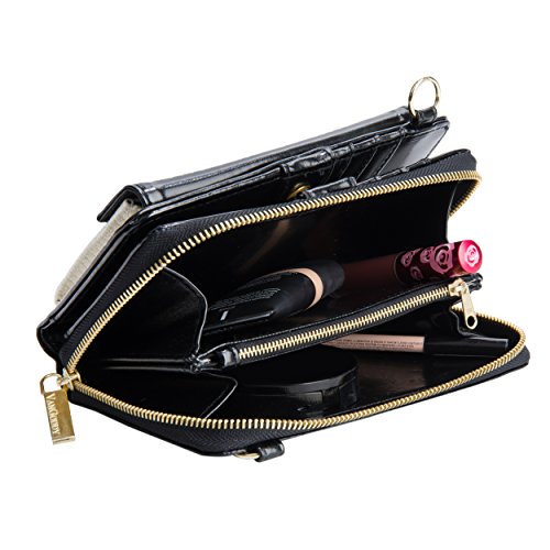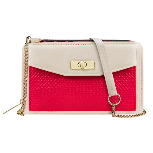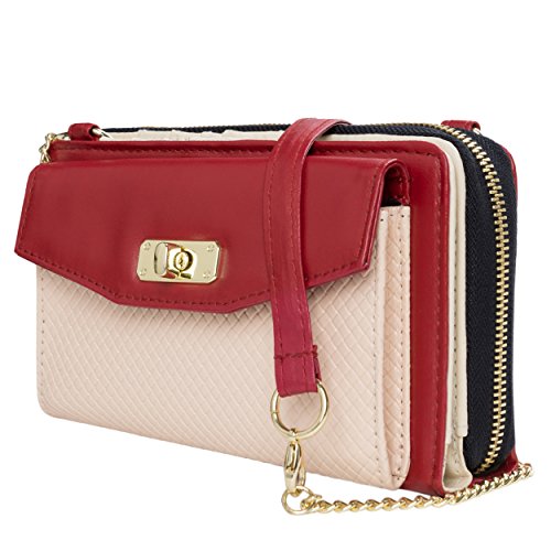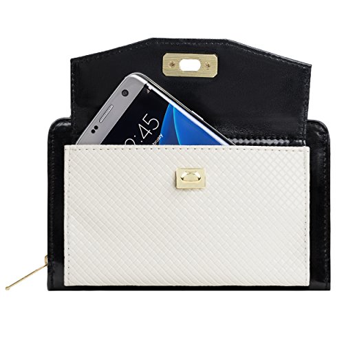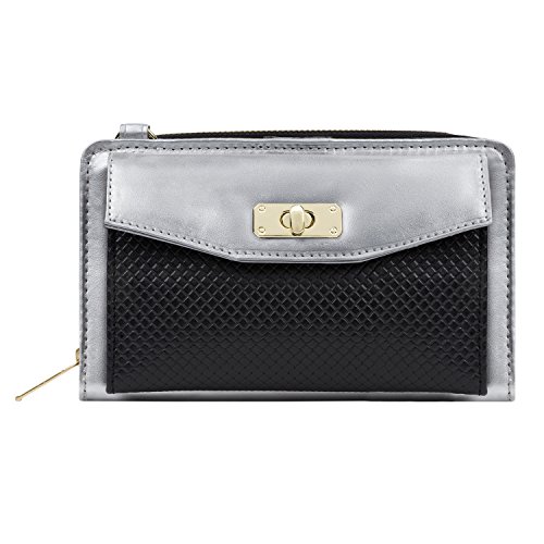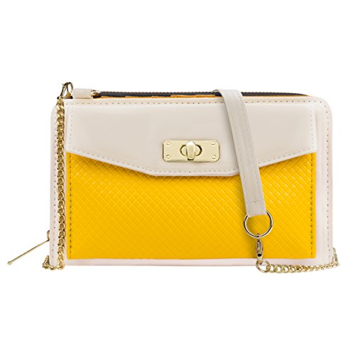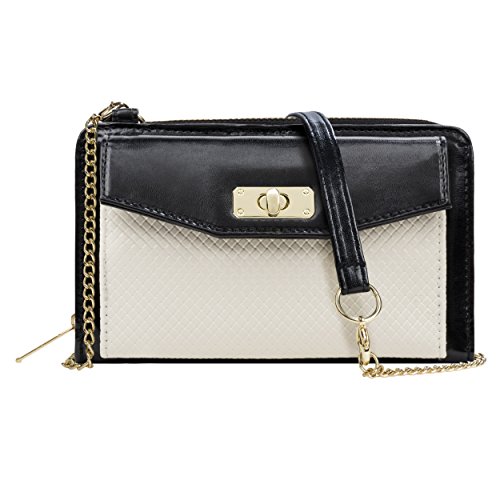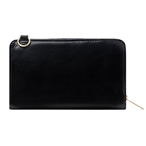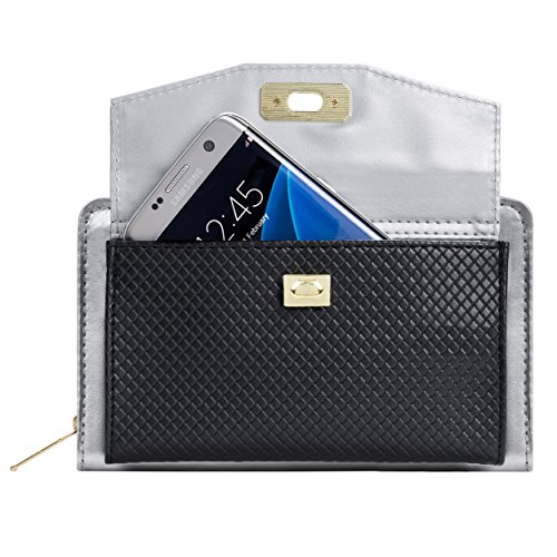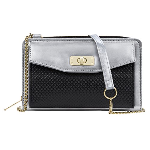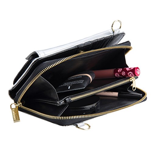 The Venice II is a Universal wallet phone clutch featuring a front pocket with a metal twist lock for holding small items such as a cellphone. The wallet has 9 card holders and one clear ID card holder to make it easy to organize the essential cards. Venice II has spacious interior pocket to store multiple small items such as money, makeup, pens, etc. The Exterior is made of PU leather with matching strap along with dual chains for additional height Adjustment and choice of style. The Venice II could be worn in various carrying options: Clutch, Cross-body, or Shoulder.