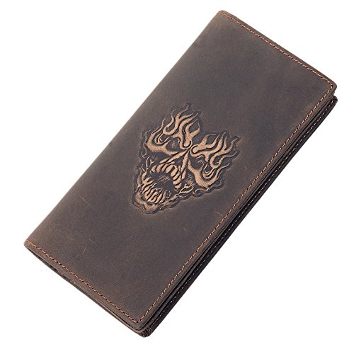-. Title : LXFF Mens Genuine Leather Long Bifold Wallet Checkbook Brown RFID Vintage Skull