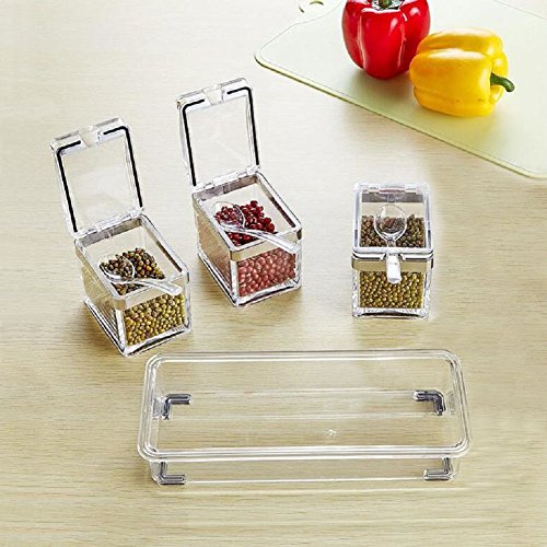 Color:Transparent Material:Durable Food Grade Acrylic Product Size:Length:7.5 inch,Width:4 inch,Highly:3.2 inch Packing Included: 3 x Transparent Seasoning Box 3 x Spoons 1 x Tray G.W. of a piece:510 g Usage: The first use of the product, please clean with detergent, and dry.Use a mild detergent, plus softer cleaning appliances (eg: sponges), add water gently scrub that is bright as new, avoid hard objects (such as: wire brush) to scrub.