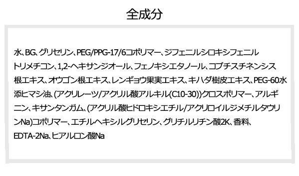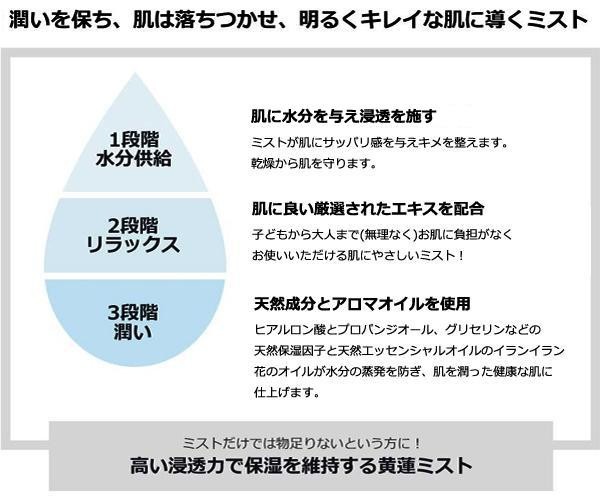 グリセリン、ヒアルロン酸などが肌に潤いとリラックス効果を与えます。乾燥や肌荒れの気になる肌に、素早く水分を与え潤いのある健やかな肌に導きます。 |