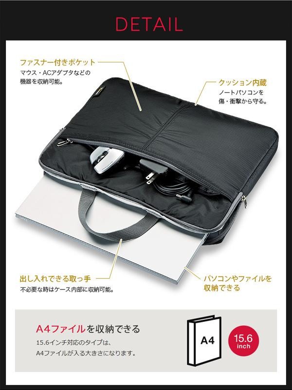 | 軽くて耐久性が高いコーデュラナイロンを使用しています。しなやかで滑らかな表面でカバンへの出し入れもストレスなくスムーズに行えます。アダプタやマウスなどが収納できるファスナーポケット付きです。 |