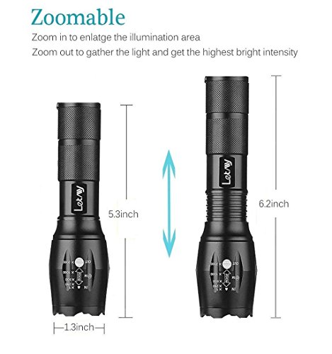 -- Zoomable tactical flashlight: zoom in or out to adjust bright intensity & illumination areas. Handy & Practical! (Max Lumens: 800; max lighting range: 826ft)