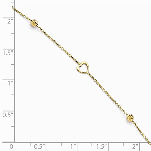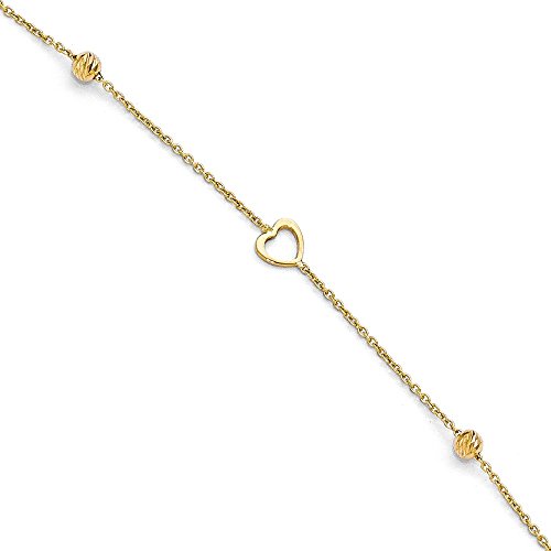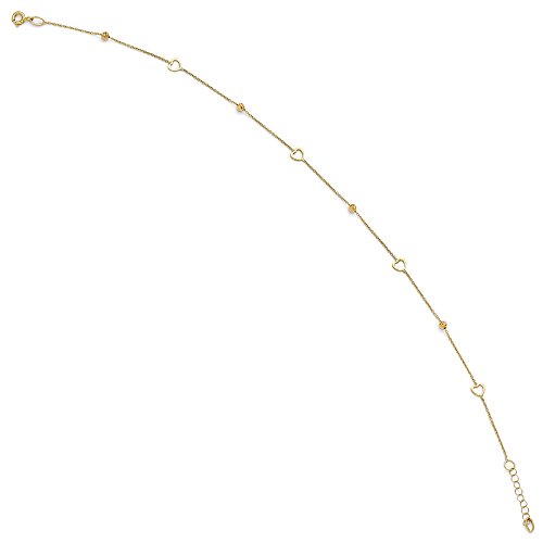 Solid 14k Yellow Gold Polished and Diamond-Cut Heart Anklet with 1in ext 10" (1mm)
