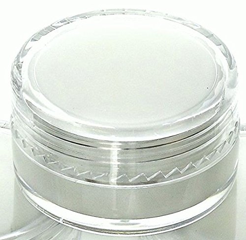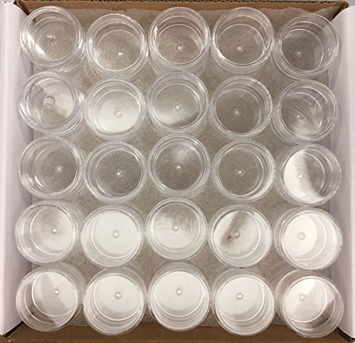 Set of 50 Clear PS plastic jars with lids. Jar capacity: 5 ml. Dimensions: 1.2 inches diameter by .64 inches height .Perfect for lip gloss, makeup, eye shadows, hand and face cream, lotions, sparkles and any other liquids and creams.