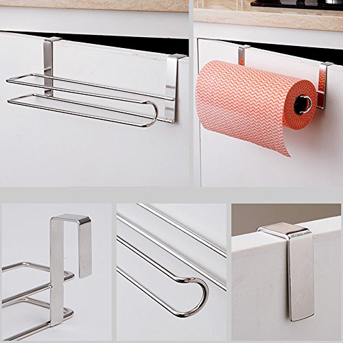 4、VERY CONVENIENT: This paper towel holder can go under the cabinet and the shelf or hang on the cabinet door. You can even move it from one location to the other depending on what your need is, keep your paper towels organized and close at your fingertips so you can reach to the paper holder every time.