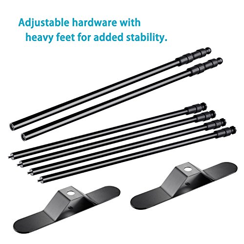 Note: Backdrop is not included Descriptions: Frame is adjustable from 75x41 inches to 120 x106 inches (Width x Height) Heavy Duty Aluminum Alloy Construction is designed for frequent use in the studio product photography Easy to assemble and quick to break down; Only needs 5-10 minutes Heavy Duty Base increases stability and strength; You can put sandbags on the base for outdoor use (sandbag not included) Included carrying case properly stores stands and poles when not in use and protects it from dirt, moisture, dust and damage Package Contents: 2 x Crossbar 4 x Stand Pole 2 x Stand Base 1 x Carrying Case 0