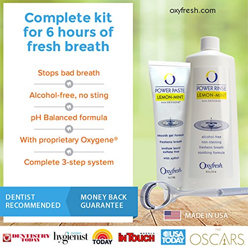 Nothing freshens your breath quite like the power of this lemon-mint mouthwash and toothpaste combination! They are naturally flavored with a unique blend of essential oils for a taste that's truly irresistible: lemon, orange, grapefruit, bergamot, lime and peppermint. Complete Fresh Breath Kit Scrape using the best scraper on the market, brush with the amazing, zesty toothpaste and swish with the power of our patented Oxygene® and zinc formula for fresh breath that lasts up to 6 hours. The Ultimate Fresh Breath Kit is ideal for: Those that want to maintain fresh breath though the day Those with chronic bad breath Dry mouth sufferers Those undergoing chemotherapy and/or radiation therapy Cosmetic support Long-term supportive periodontal maintenance Those who like lemon-mint flavor Soaking appliances, splints and removable prosthetics (partials, dentures) How to use the Oolitt® Elite Tongue Scraper Rinse your Oolitt Elite Tongue Scraper before and after using it to remove bacteria and food debris that may be present. Start cleaning at the back of your tongue, and work your way forward. Scrape and clean the entire top and side surfaces of your tongue, not just the center. Rinse your mouth out with water when done. How to use the Lemon-Mint Power Paste Squeeze a small drop of Lemon-Mint Power Paste onto your toothbrush and brush your teeth for 2 minutes. Brush your teeth from front to back, moving from left side of your mouth to the right, or if you prefer, right to left. Make sure to clean the outer surface of your teeth, then the inner surface, and finally the chewing surface. Rinse your mouth out with water when done. How to use the Lemon-Mint Power Rinse Shake well before using. Swish one or two capfuls for a minimum of one full minute. Refrain from rinsing, eating or drinking for up to 30 minutes. 0 |