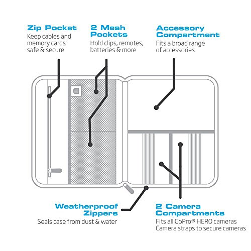 -. Feature : 2 Camera Compartments: Fits all GoPro HERO cameras/Camera straps to secure cameras / Large Accessory Compartment: Fits a broad range of accessories / 2 Mesh Pockets: Hold clips, remotes, batteries & more / Zip Pocket: Keep cables and memory cards safe & secure / Durable Materials: Weatherproof zippers & canvas backing