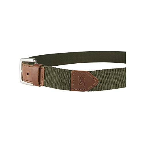 Product Description The Browning Upland Belt is a great combination of cotton webbing and genuine leather. The 1 1/2" wide belt features a zinc alloy buckle. Color: Forest green with natural brown leather 0