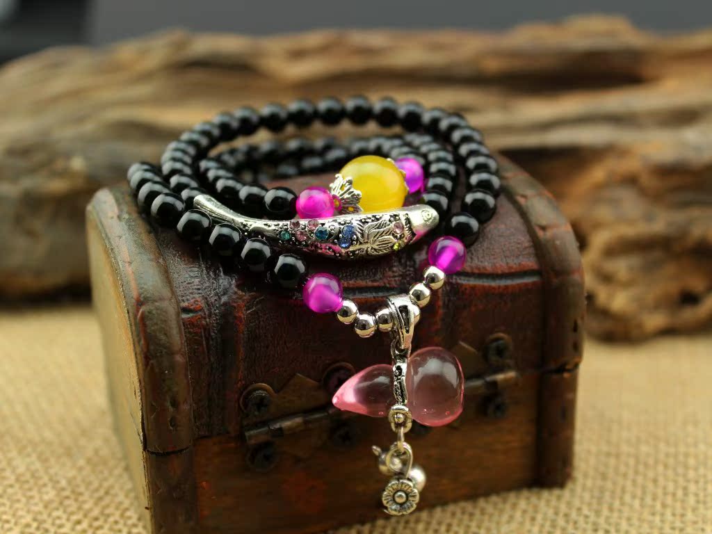 嗡( oom ) 嘛 ( ma ) 呢( ne) 呗( bei) 咪( mei )吽( honeg) 六字大明咒,又名:六字真言,大悲心咒。它被称为“万咒之王”,没有任何咒语被认为胜过它。它不仅包括了所有咒的功用,也涵盖了其他咒所有的力量和加持。念诵时,会得到无比殊胜的功德。 六字大明咒是佛冠上的如意宝王,是求解脱者的无上妙道,是十方诸佛的最上精华,是总摄八万四千法蕴为一体的大总持,是诸佛难测的观自在菩萨的微妙本心,是点铁成金、转凡成圣的灵丹妙药。 功能:玛瑙属于水晶家族成员之一,颜色齐备。不论任何颜色的玛瑙,它的能量都有着沉厚、安定及柔和特性。所以,它能帮助人体的每一个轮位(亦称能量中心),达到平行、隐定。一点也不刺激地,便可加强了每一轮位的功能和力量了。此外,还可帮助个人平伏紧张的情绪。「玛瑙」更是佛教的七宝石之一,可作辟邪用。自古以来学者把玛瑙视为宝石中的“第三眼”,象征友善的爱心,也代表希望。