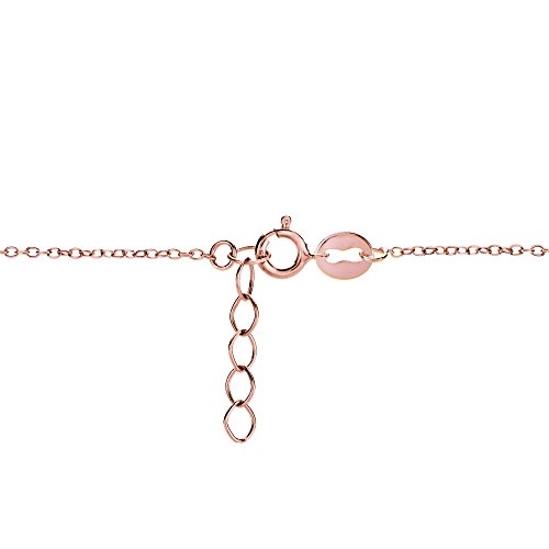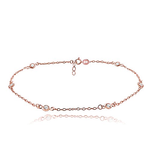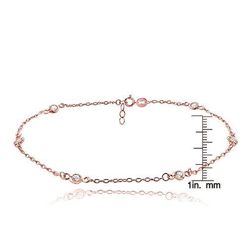 •The rose gold tone over sterling silver anklet features round cubic zirconia stones framed in rose gold tone over sterling silver. The chain includes a one inch extender for an adjustable length. Charm dimensions: 6mm wide x 4.4mm long. Ring setting dimensions: 15mm wide.