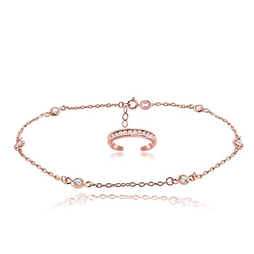Oozing with simple elegance, this rose gold tone over sterling set anklet and toe ring set is studded with a row of cubic zirconia. Designed in sterling silver.
