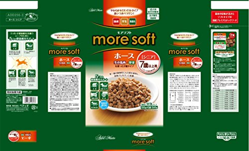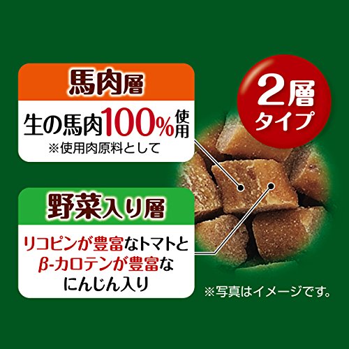 原材料:肉類(馬)、小麦粉、でんぷん類、脱脂大豆、小麦たん白、砂糖、植物性油脂、小麦ブラン、トマト、乳酸菌(ラクリス)、にんじん、しそオイル、オリゴ糖、グルコサミン、γ-リノレン酸、グリセリン、プロピレングリコール、ミネラル類(リン・カルシウム・カリウム・マンガン・亜鉛・鉄・銅・ヨウ素・コバルト・ケイ素)、ソルビトール、リン酸塩(Na)、膨張剤、保存料(ソルビン酸K)、酸化防止剤(エリソルビン酸Na)、ビタミン類(A・B2・B12・D・E・コリン)、メチオニン