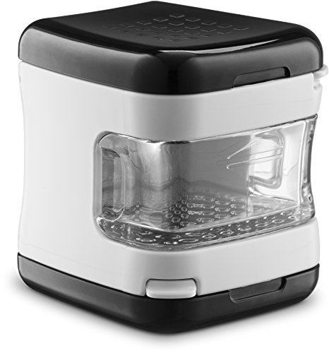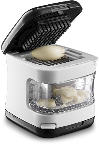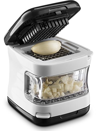 - KEEP YOUR HANDS CLEAN WHILE GETTING THE RESULTS YOU WANT - The cube is designed to keep your hands clean and odor-free just place the clove on the blade and close the lid to slice and dice. The removable container will collect the garlic so you do not have to touch them. Sliding tab removes any leftover peels, and the blade can be removed easily for cleaning.