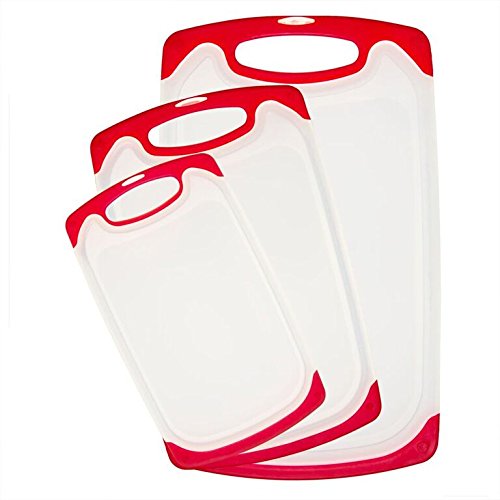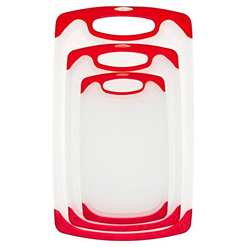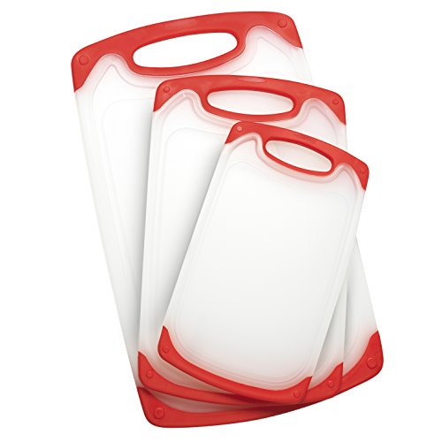 Plastic Cutting Board Set – Premium 3-piece Chopping Boards -Stylish Cream White Board with Red Non Slid Handles (Red Transparent)