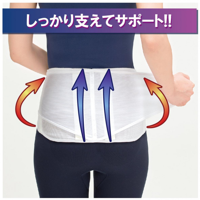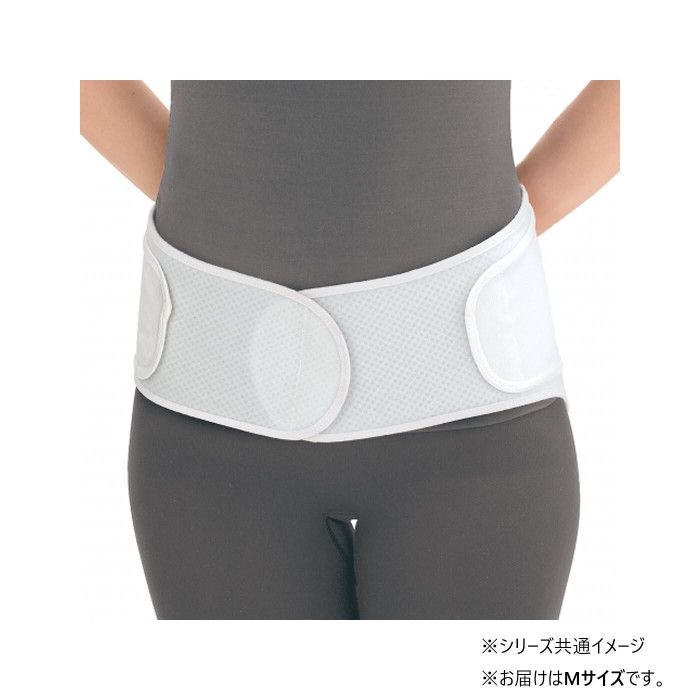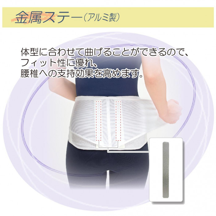 | メッシュ加工のためムレなどを防ぎ、快適な装着感です。サイズ別に適確な立体裁断を施しているため、確実な装着が行えます。補助ベルトにより腹圧をさらに上昇させ、金属ステーが効果的にサポートします。 |