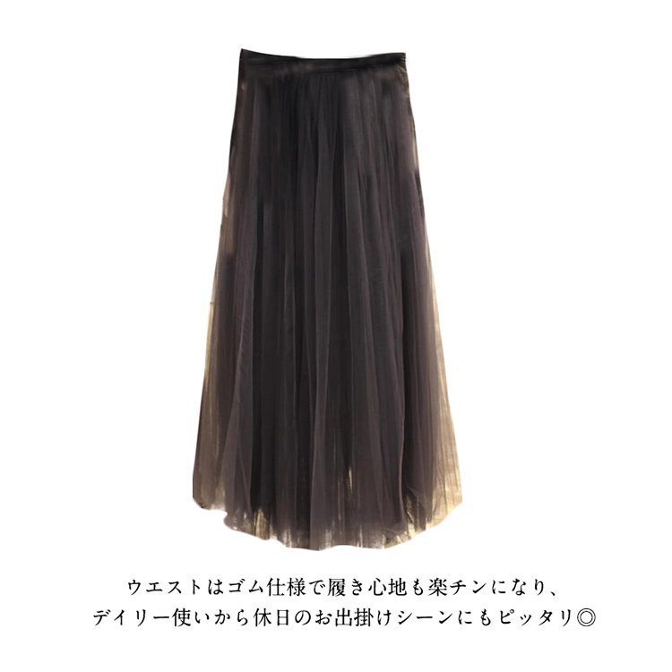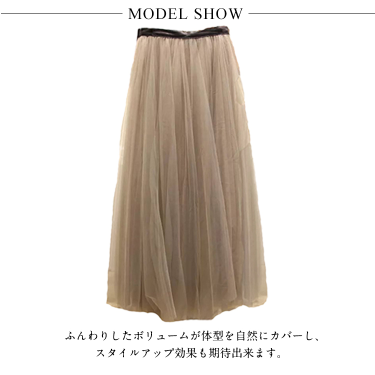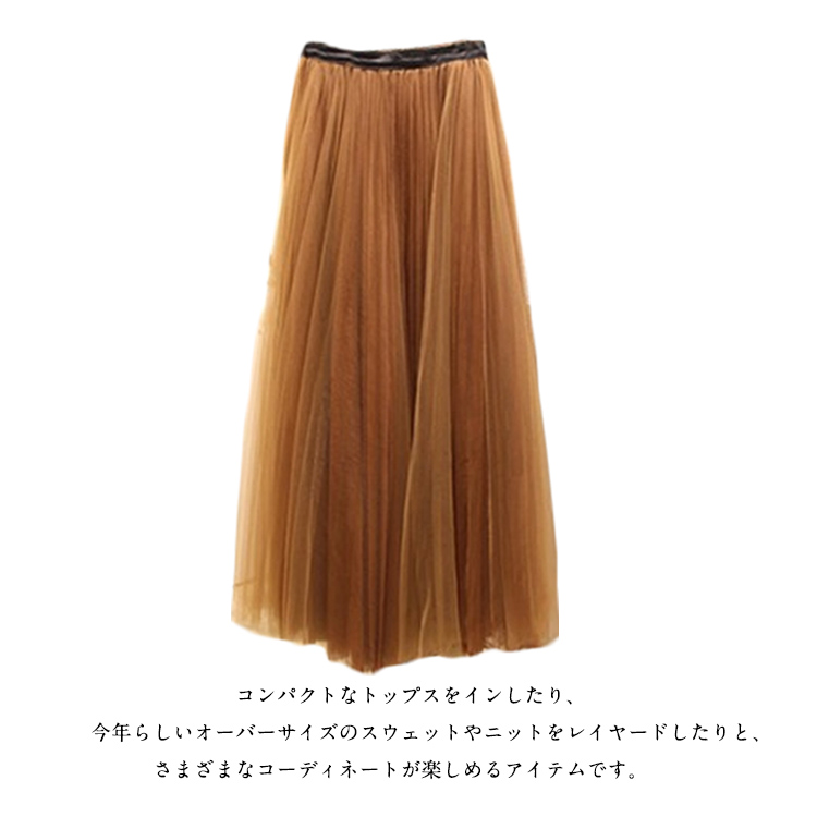 | 取り入れるだけで旬なフェミニンスタイルが完成するチュールスカートです。ふんわりしたボリュームが体型を自然にカバーし、スタイルアップ効果も期待出来ます。ウエストはゴム仕様で履き心地も楽チンになり、デイリー使いから休日のお出掛けシーンにもピッタリ◎コンパクトなトップスをインしたり、今年らしいオーバーサイズのスウェットやニットをレイヤードしたりと、さまざまなコーディネートが楽しめるアイテムです。 | |