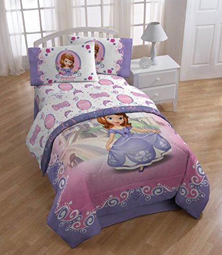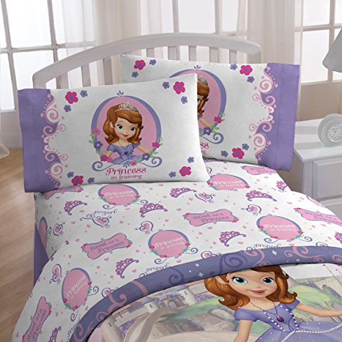 Transform any child's bedroom with a Disney Sofia the first introducing Sofia 3 piece Twin sheet set. This fun and colorful bedding sheet set will make any child smile. Each 3 piece, super soft microfiber Twin sheet set includes a fitted sheet, flat sheet and one standard reversible pillowcases. The bold colors and exciting design will enhance the existing decor of any kid's or toddler bedroom. Fitted sheet measures 39" x 75", flat sheet measures 66" x 96" with one 20" x 30" standard pillowcases. Decorative bedding features popular characters and icons from the movie. 100percent polyester. Easy care, machine wash cold, tumble dry low. ImportedFeature