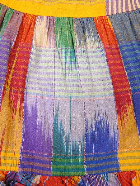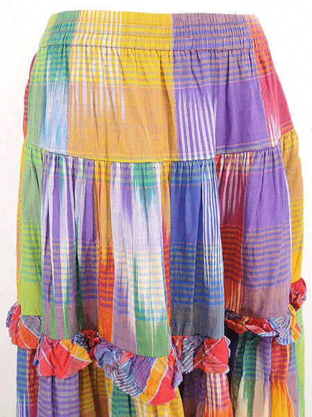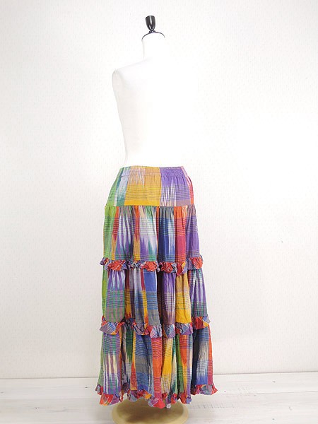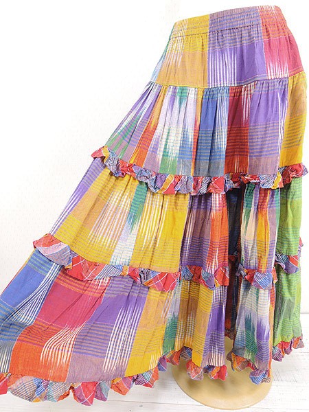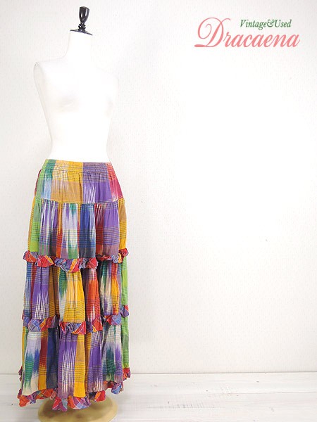 カラフルエスニックカラーのティアードロングスカート。