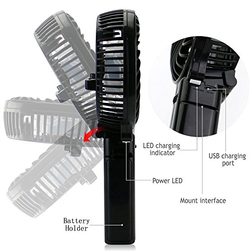 Mini Foldable design; can be used as a desktop fan or handheld fan. With a hanger can be attached to umbrella.