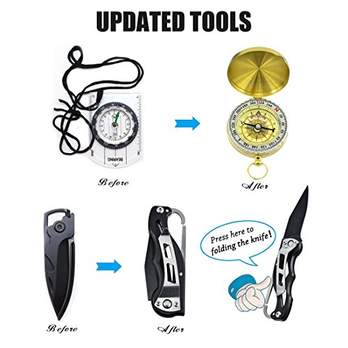 ✔ AVOID GETTING LOST & MULTIPLE LIGHTING : Compass of military grade, Features 360 degree rotating bezel for easy navigation & orienteering; A 3 light modes flashlight(Needs 1 AA battery, NOT INCLUDED) and a portable mini light to make sure enough emergency illumination in darkness.